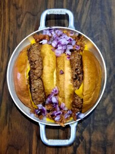Burger de Grão de Bico com Alho poró, Queijo prato, Alface, Tomate, Cebola, Maionese do Bruxo no Pão de Brioche.