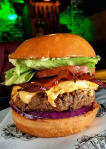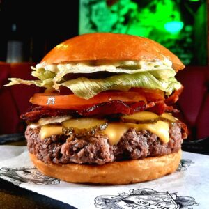 Burger 150g, Ovo, Queijo Prato, Alface, Tomate, Cebola Roxa, Bacon, Maionese do Bruxo no Pão de Brioche.