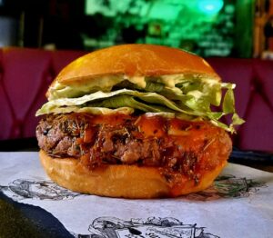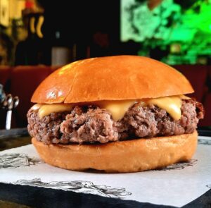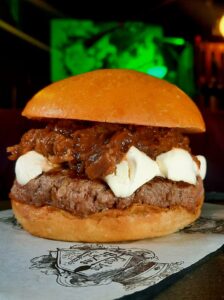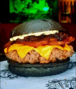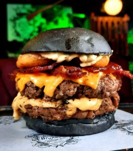 Burger 150g, Cheddar, Bacon, Cebola Caramelizada, Maionese do Bruxo no Pão Preto.