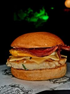 Burger de Frango 120g, Queijo Prato, Ovo, Bacon, maionese do bruxo, Pão de brioche.