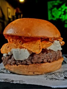 Burger 150g, Cream chesse, Geleia de Pimenta do Elfo, Nachos no Pão de Brioche.